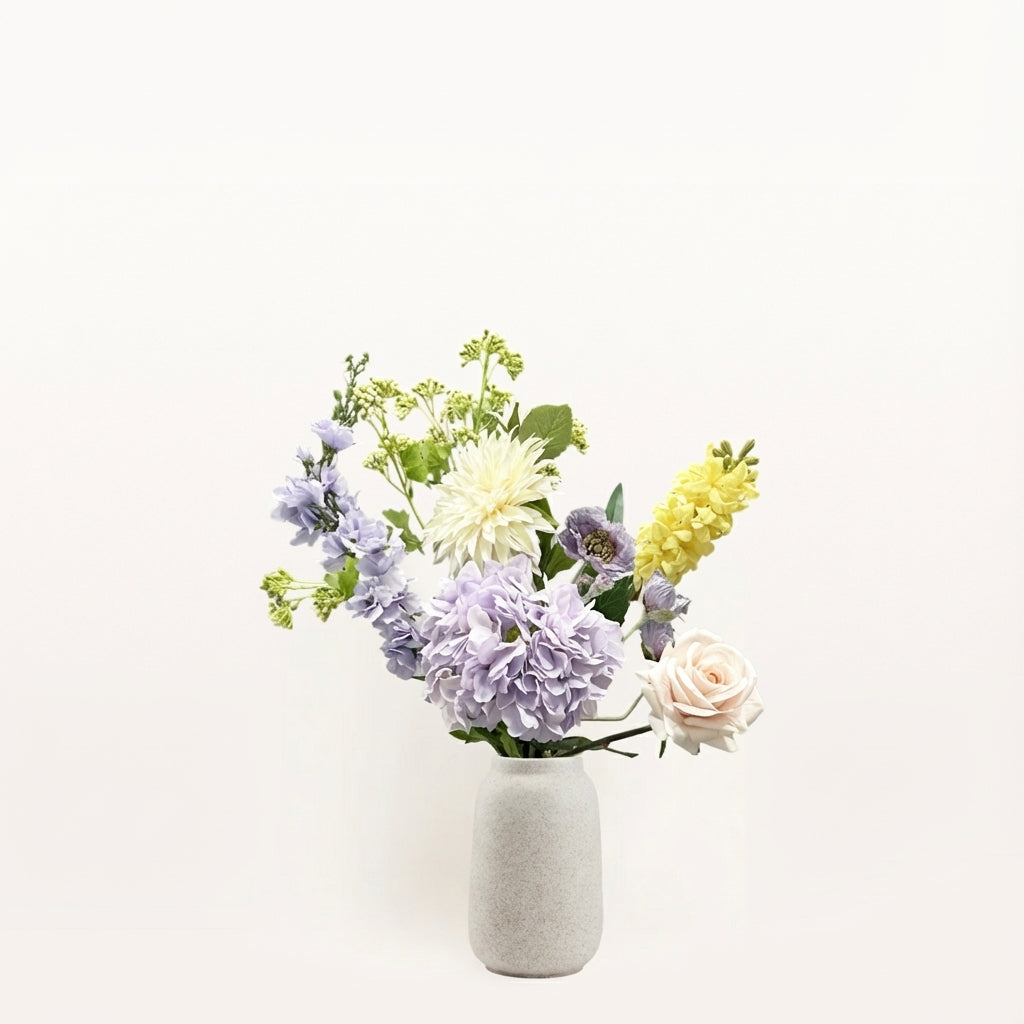 Bringen Sie dauerhafte Eleganz in Ihr Zuhause mit diesem handgestylten Seidenstrauß. Die sorgfältig ausgewählten Stiele sind bis ins kleinste Detail lebensecht und bewahren ihre natürliche Form und feine Ausstrahlung, Saison für Saison. Die Kombination aus Blumen und Zweigen sorgt für eine reiche, aber luftige Komposition, die mühelos jeder Räumlichkeit Atmosphäre verleiht.