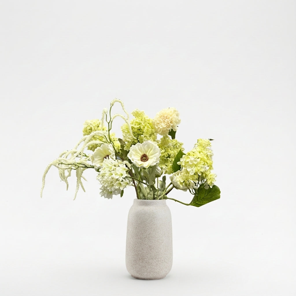 Bringen Sie dauerhafte Eleganz in Ihr Zuhause mit diesem handgestylten Seidenstrauß. Die sorgfältig ausgewählten Stiele sind bis ins kleinste Detail lebensecht und bewahren ihre natürliche Form und feine Ausstrahlung, Saison für Saison. Die Kombination aus Blumen und Zweigen sorgt für eine reiche, aber luftige Komposition, die mühelos jeder Räumlichkeit Atmosphäre verleiht.