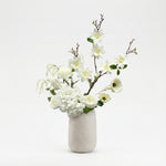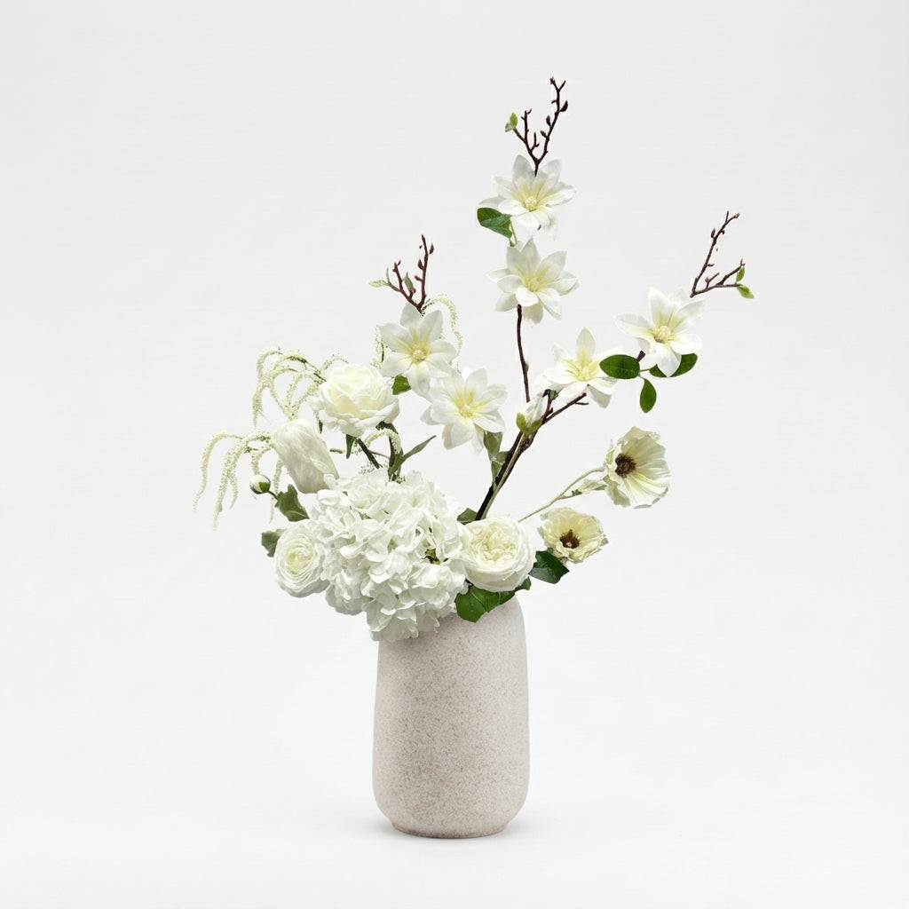 Bringen Sie dauerhafte Eleganz in Ihr Zuhause mit diesem handgestylten Seidenstrauß. Die sorgfältig ausgewählten Stiele sind bis ins kleinste Detail lebensecht und bewahren ihre natürliche Form und feine Ausstrahlung, Saison für Saison. Die Kombination aus Blumen und Zweigen sorgt für eine reiche, aber luftige Komposition, die mühelos jeder Räumlichkeit Atmosphäre verleiht.