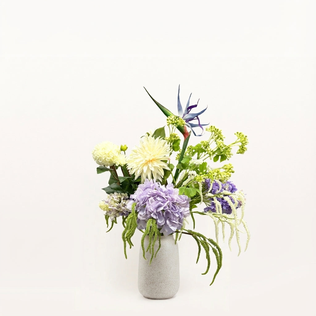 Breng blijvende elegantie in huis met dit handgestylede zijden boeket. De zorgvuldig geselecteerde stelen zijn levensecht tot in elk detail en behouden hun natuurlijke vorm en verfijnde uitstraling, seizoen na seizoen. De combinatie van bloemen en takken zorgt voor een rijke, maar luchtige compositie die moeiteloos sfeer toevoegt aan iedere ruimte.